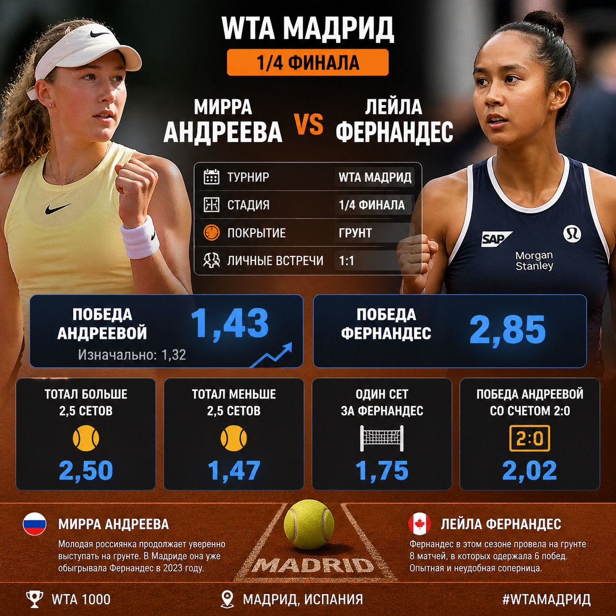 На мадридском грунте в четвертьфинале WTA развернётся захватывающее противостояние между россиянкой Миррой Андреевой и канадкой Лейлой Фернандес.