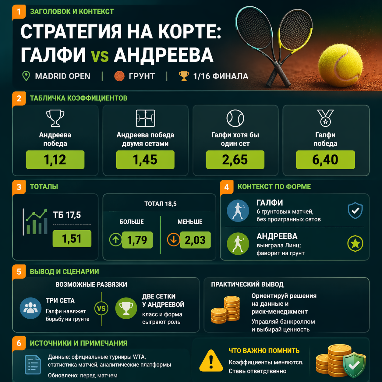 Андреева — фаворит с коэффициентом 1,12; при победе двумя сетами — 1,45. Галфи же — достойный соперник: за шесть последних матчей на грунте она не проиграла ни одного сета; ставка на то, что Галфи возьмёт хотя бы один сет — 2,65; победа Галфи — 6,40.