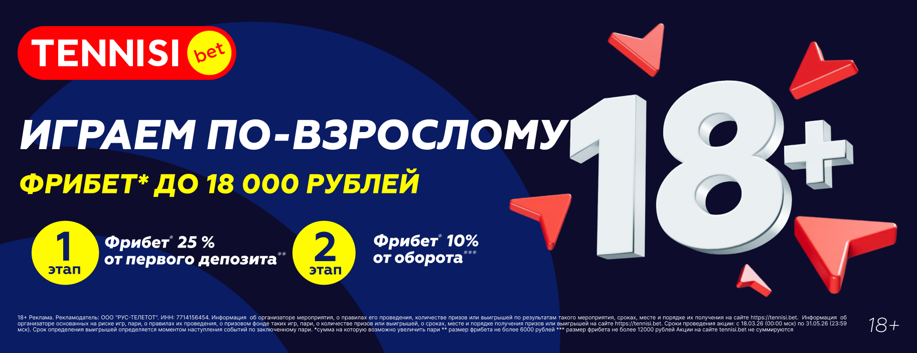 Букмекерская контора «Тенниси» дает всем новым игрокам двойной приветственный фрибет – номиналами до 6 000 и до 12 000 рублей. Чтобы получить первую часть фрибета, необходимо внести депозит после регистрации и верификации. Вторая часть фрибета рассчитывается в зависимости от суммарного оборота ставок, совершенных игроком в течение 14 календарных дней после внесения депозита.