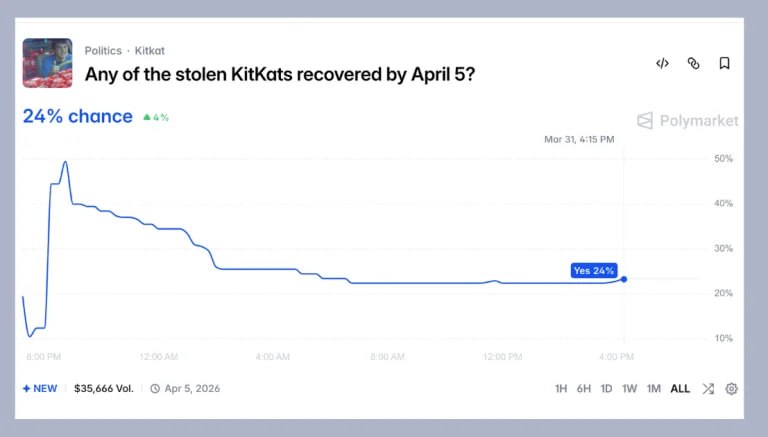 На платформе прогнозов Polymarket участники оценили вероятность того, что хотя бы часть из 12 тонн украденных шоколадных батончиков KitKat будет найдена до 5 апреля, на уровне 24%.