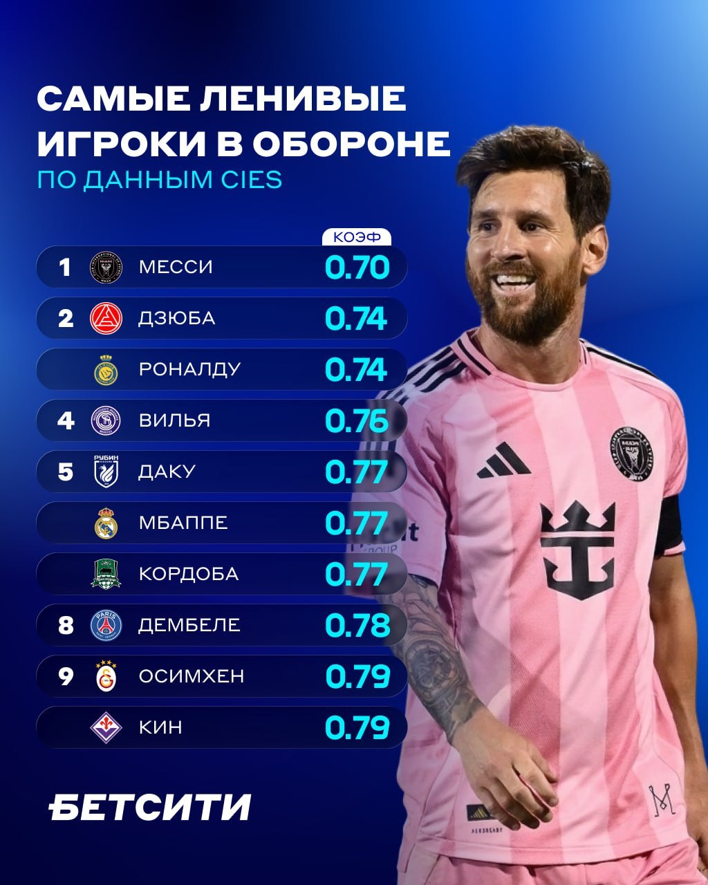 В тройке лидеров оказались атакующие звёзды: Лионель Месси — 0.70, Артём Дзюба — 0.74 и Криштиану Роналду — 0.74. Это значит, что Месси в обороне проходит примерно 700 метров, тогда как Дзюба и Роналду — по около 740 метров каждый. В десятку вошли также Килиан Мбаппе (0.77), Мирлинд Даку (0.77), Джон Кордоба (0.77), Дембеле (0.78), Осимхен (0.79) и Кин (0.79).
