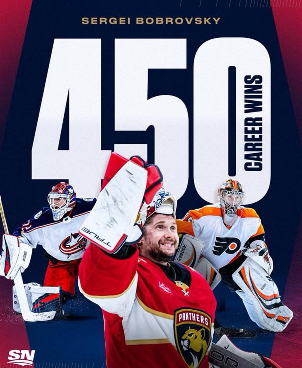 Вратарь «Флориды» Сергей Бобровский в матче с «Бостоном» оформив 450‑ю победу в регулярном чемпионате НХЛ (5:4 Б), стал рекордсменом лиги по наименьшему числу сыгранных матчей, понадобившихся для достижения этого показателя.