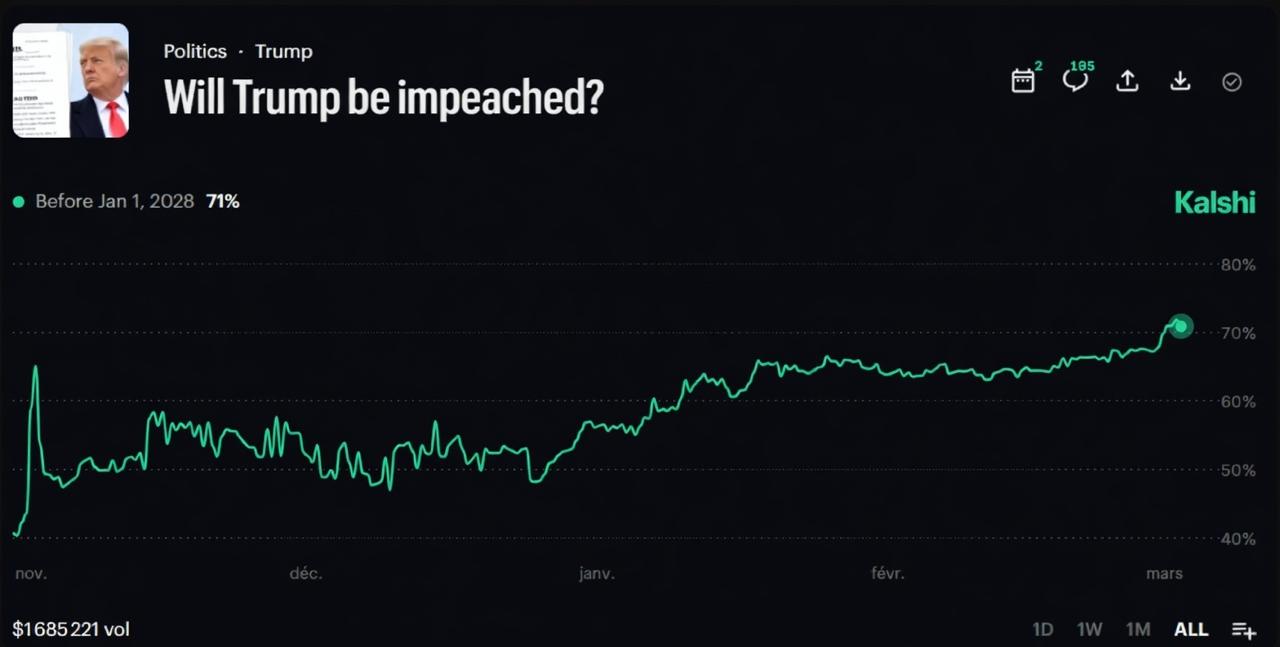 Рынки прогнозов фиксируют беспрецедентный интерес к возможному отрешению Дональда Трампа от должности, подняв вероятность этого события до 71%.